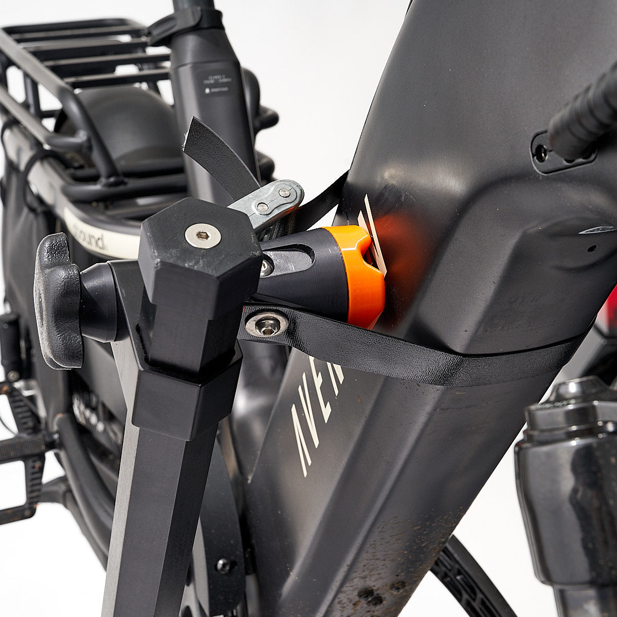 Adjustable fit to secure most E-bike frames and wheels on the market